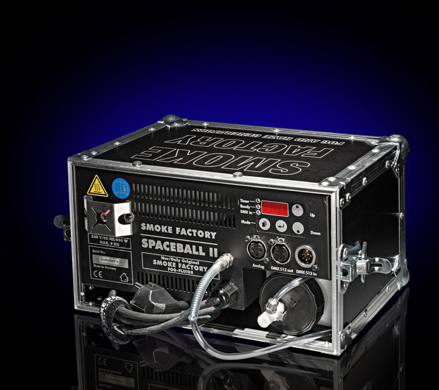 Spaceball II je malý a kompaktní kouřostroj, nabitý nejnovějšími digitálními technologiemi: DMX, mikroprocesor, časovač. Má slušný výkon, a přitom malou spotřebu. Je dodáván včetně transportního obalu.