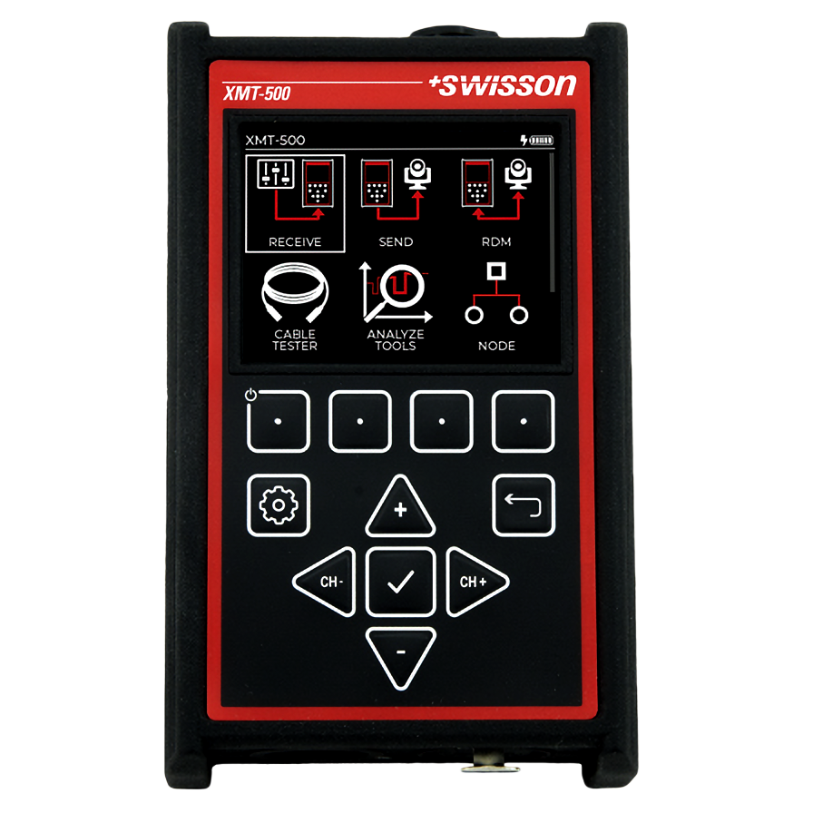 Kontrolér a tester XMT-500 obsahuje užitečné funkce pro DMX, RDM, Art-Net, sACN, testování signálu a testování kabelů. Zatímco funkce DMX umožňuje odesílat hodnoty do libovolného kanálu DMX nebo sledovat přijímané signály, funkce RDM pomáhají vyhledávat a dálkově konfigurovat svítidla kompatibilní s RDM. Kromě toho lze v režimu příjmu odesílat nebo prohlížet příkazy sACN a Art-Net. Testování signálu pomáhá kontrolovat integritu signálu a poskytuje přehled o toku signálu v reálném čase a sleduje časové aspekty DMX & RDM. Někdy jsou problémy jednoduše způsobeny vadnými kabely, funkce testování kabelů automaticky skenuje všechny konektorové spoje v jakémkoli 3kolíkovém nebo 5kolíkovém kabelu DMX i kabelu RJ-45. Díky hardwarovému klíči pro testování kabelů lze snadno testovat i nainstalované kabely.